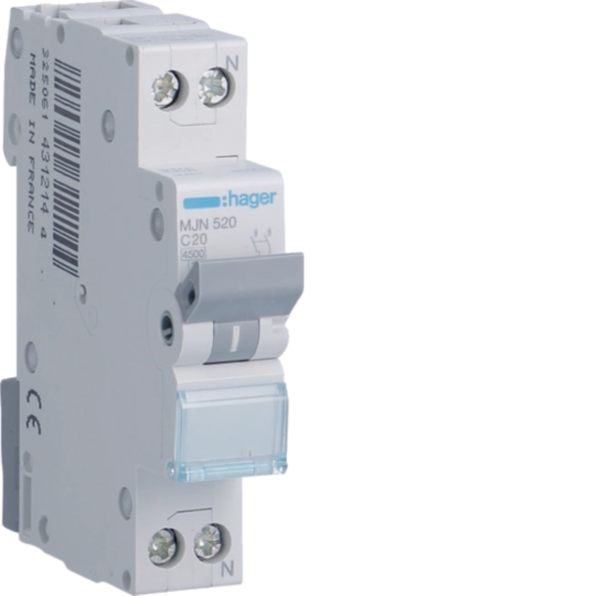 Siguranta automata (disjunctor) premium Hager MJN520, 1P+N, curba C, 20A, cu putere de rupere 4.5kA, proiectata pentru protectie electrica fiabila si performanta ridicata. O solutie de inalta calitate, ideala pentru instalatii rezidentiale si comerciale moderne.